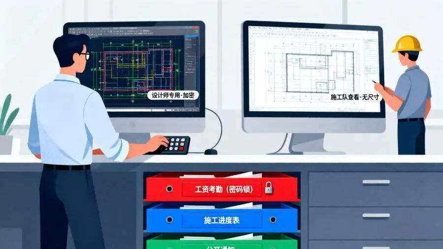 資料分好“保密等級(jí)”:重要的圖紙別誰都能看,比如只有設(shè)計(jì)師能打開帶尺寸的詳細(xì)圖,施工隊(duì)看簡(jiǎn)化版就行;工人的考勤數(shù)據(jù)、工資信息單獨(dú)存,設(shè)密碼鎖,別和施工進(jìn)度表混在一起。