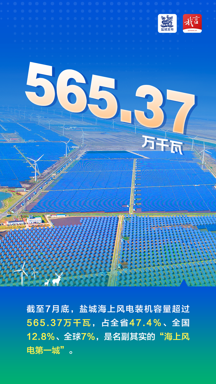 鹽城集聚國家能源、華電、國電投、華能、大唐、華潤等“五大六小”所有新能源開發(fā)央企。截至7月底,鹽城海上風(fēng)電裝機容量超過565.37萬千瓦,占全省47.4%、全國12.8%、全球7%,是名副其實的“海上風(fēng)電第一城”。