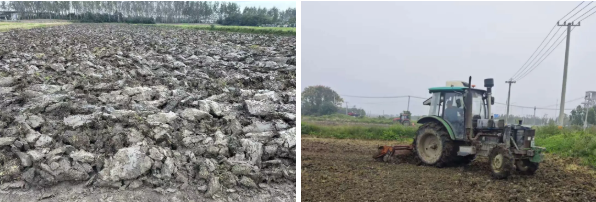 為預(yù)防連續(xù)陰雨天氣給秋播耕整帶來的“爛耕”“爛種”風(fēng)險,水稻收割一結(jié)束,技術(shù)人員便迅速深入田間,逐塊排查墑情。對于土壤濕度大、易積水的地塊,立即開挖排水溝,加速積水排出,降低土壤含水量,為耕整作業(yè)掃清障礙。在耕整過程中,公司嚴(yán)格執(zhí)行秸稈還田率達(dá)到100%標(biāo)準(zhǔn),將農(nóng)業(yè)廢棄物變廢為寶,既改善土壤結(jié)構(gòu),又增加有機(jī)質(zhì)含量;旋耕整地嚴(yán)格把控質(zhì)量,土壤深翻深度控制在25—30厘米,確保耕作層疏松透氣,有利于小麥根系下扎;農(nóng)機(jī)操作要求“耕翻到頭、到邊,無漏耕、無死角”,確保地塊耕整質(zhì)量均勻一致,為高質(zhì)量播種打造“優(yōu)質(zhì)土壤環(huán)境”。