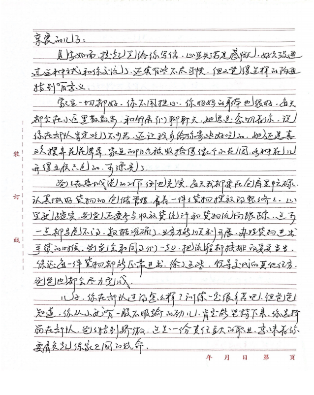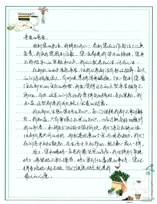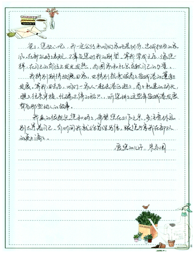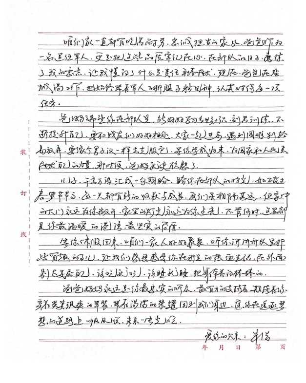 字里行間流露出對雙親的敬仰之情,細數(shù)在軍旅或職場中的成長點滴,并鄭重承諾將“忠誠、奮進”的家風薪火相傳,以實際行動回饋家庭與社會,同時深切期盼家庭團聚的美好時光。