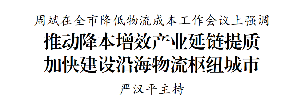 8月15日,全市降低物流成本工作會議召開。市委書記周斌出席會議并講話。他強調,要深入學習貫徹習近平總書記關于現(xiàn)代物流的重要論述和對江蘇工作重要講話精神,認真落實中央決策部署和省委省政府工作要求,全面推動物流降本增效、產業(yè)延鏈提質,加快建設具有全國影響力的沿海物流樞紐城市。市委副書記、代市長嚴漢平主持會議。