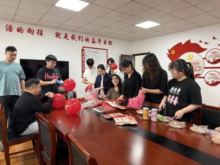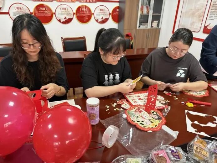活動伊始,紅色的國旗與五彩氣球便在指尖翻飛成景。員工們分工協(xié)作,掛燈籠框架、鋪賞月桌布,半小時(shí)內(nèi),活動室已氤氳著雙重喜慶——墻面的國旗輝映著案頭的桂花枝,提前備好的兔形燈架靜待添彩,節(jié)日的熱鬧氛圍瞬間拉滿。