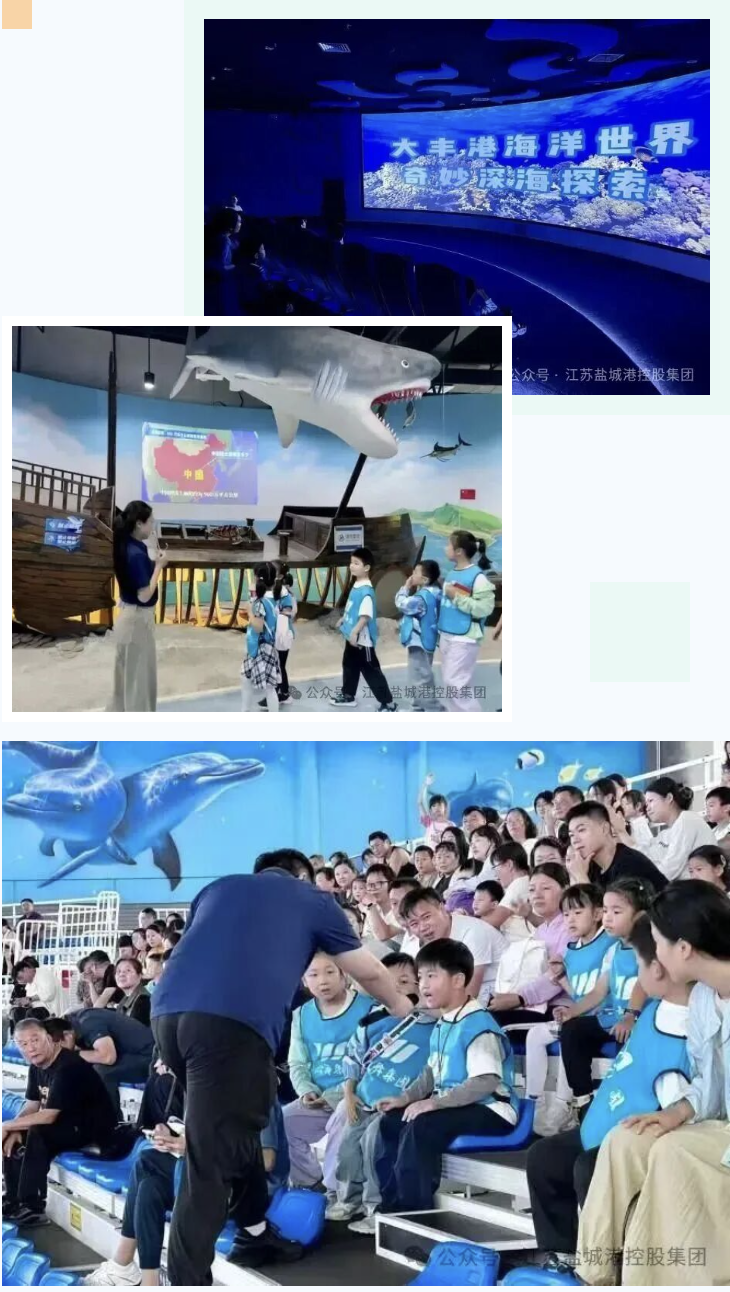 最后,孩子們踏入升級(jí)后的大豐港海洋世界科技館,沉浸式體驗(yàn)瞬間拉滿——VR實(shí)景秒變“海盜王”、5D星空影院帶你“魂穿”深海秘境。“海洋世界尋寶”活動(dòng)一開啟,孩子們化身“尋寶小達(dá)人”,歡快穿梭在場(chǎng)館內(nèi),“看,我找到一個(gè)”“耶!我找到兩個(gè)”,歡呼聲此起彼伏。講解員以生動(dòng)故事拆解復(fù)雜科學(xué)知識(shí),讓孩子們?cè)诨?dòng)中主動(dòng)探索,實(shí)現(xiàn)“玩中學(xué)、學(xué)中悟”。海洋劇場(chǎng)內(nèi),主持人進(jìn)行著海洋知識(shí)科普,訓(xùn)練員與聰明的海豚默契配合演繹著高空華爾茲,讓孩子們?cè)跉g笑聲中樹立守護(hù)藍(lán)色家園的意識(shí)。活動(dòng)尾聲,大家共同回顧全天收獲,分享難忘瞬間,為這場(chǎng)研學(xué)之旅畫上圓滿句號(hào)。