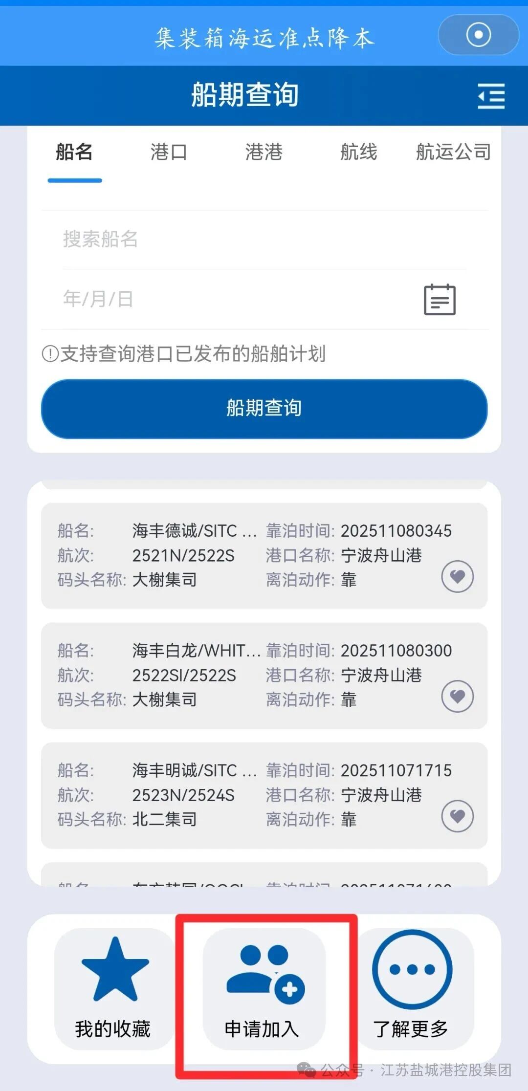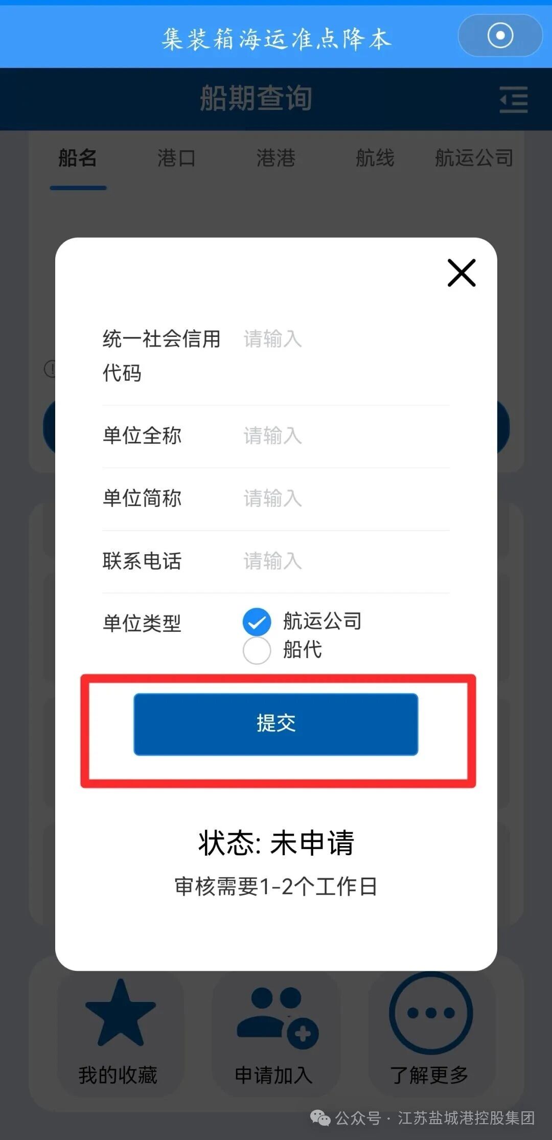 第三步:航運公司第一次登錄該模塊的用戶,系統(tǒng)默認顯示為船期查詢頁面,用戶點擊“申請加入”按鈕,選擇“我要加入”之后,輸入統(tǒng)一社會信用代碼、單位名稱、聯(lián)系電話、公司類型等相關信息,提交信息后,1-2個工作日之內(nèi),即可獲得完整的“準點降本”模塊使用權限。