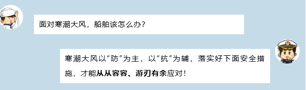 2、提前研判防抗措施。結(jié)合船舶抗風(fēng)等級,預(yù)先做好寒潮大風(fēng)防抗準(zhǔn)備,抗風(fēng)能力較差的船舶選擇安全水域進(jìn)行避風(fēng)。